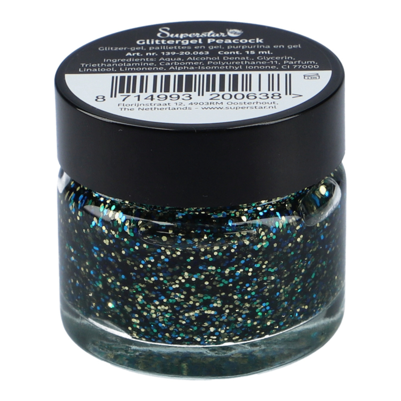 Artikelnummer: 139.20.063De Superstar Glittergel bevat polyester glitter van cosmetische kwaliteit in een gel basis. Hierdoor kan de gel gebruikt worden op zowel het haar als de huid. De gel is zo ontwikkeld dat je deze ook aan kan brengen op Face- and Bodypaint zonder dat het deze oplost. Bovendien droogt de gel snel op. Voor een super glinsterend effect kan je een extra laag losse glitters aanbrengen wanneer de gel nog nat is.